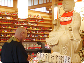 『石の水子地蔵さん』水子供養法要当日は、先に本堂で追善法要を行います。引き続き蓮華堂に石のお地蔵さまを奉安していただきます。皆様のお地蔵さまへは、毎月24日に読経させていただきます。33ヶ月間は蓮華堂にお参りいただきますが、期間の満了後はお地蔵さまを絆縁堂(ばんえんどう)に移します。蓮華堂・絆縁堂ともに、いつでも自由にお参りいただけます。絆縁堂に移動後も、毎月24日に読経いたしております。 供養料:35,000円 |